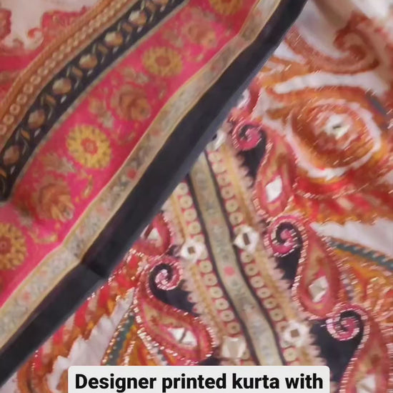 Digital printed semi stitched kurta set with real mirror embroidery on yoke kurta set with dupatta.