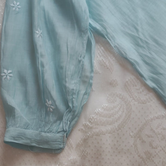 This semi-stitched Sky Blue Chikankari Shirt is part of the designer collection and features authentic Lucknowi chikankari handwork.