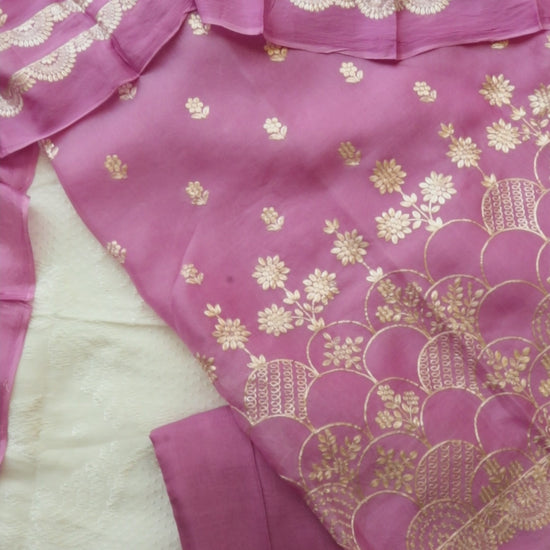 Pure organza lavender color with gold embroidery dress material.