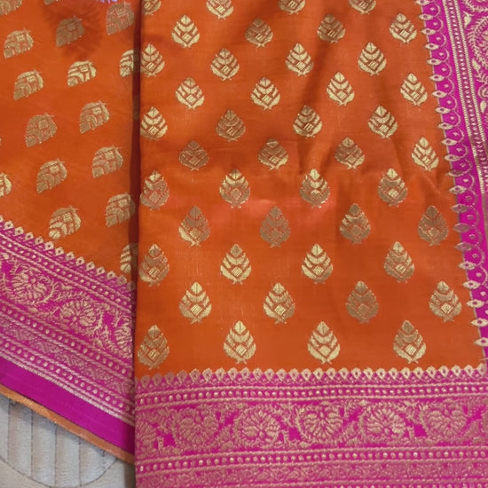 Beautiful Orange and pink saree with border. This style makes you look amazing.
