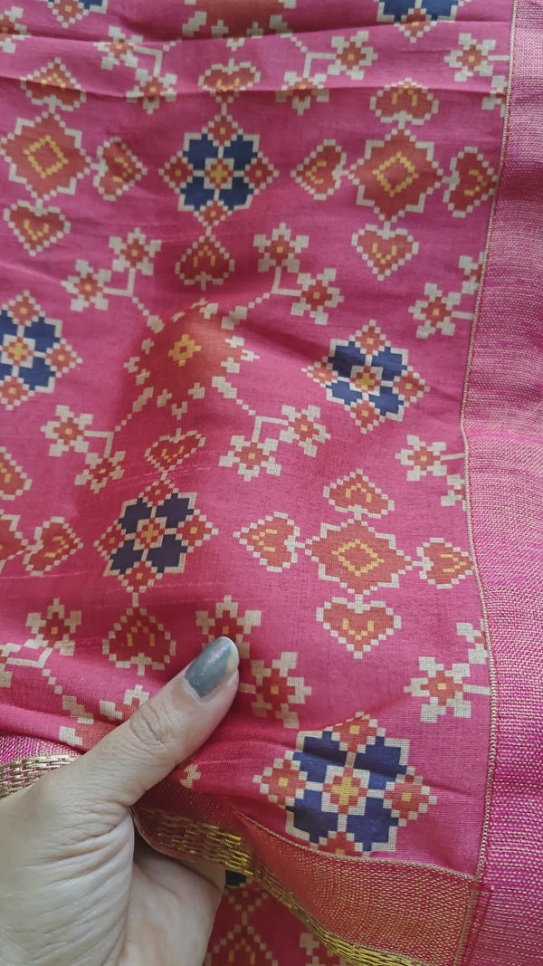 Patola print on saree with border in pink. Tussar silk printed traditional saree