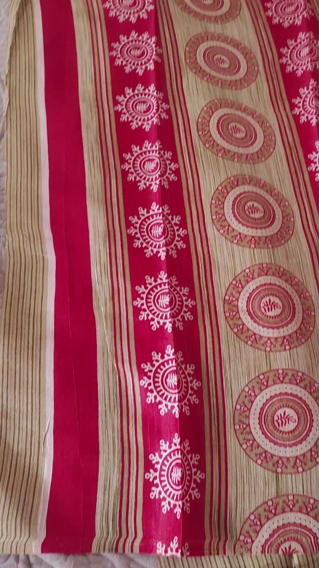 Printed Red beige saree made of sugarcane fibres.